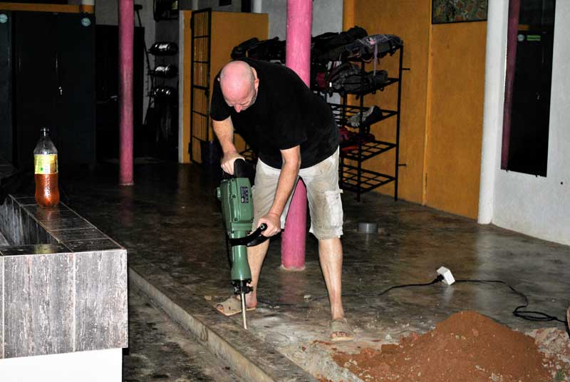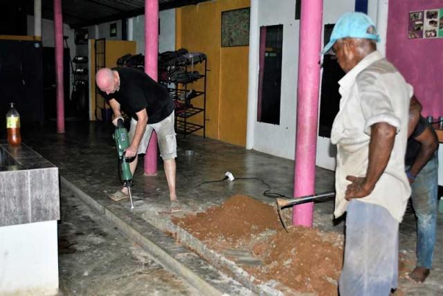 Leider ist Zeit immer knapp bemessen und manchmal kommen alle Probleme auf einmal. Momentan haben wir hier eine heftige Monsunzeit und es regnet an vielen Stellen rein. Zusätzlich gibt es noch Wasserrohrbrüche oder verstopfte sanitäre Anlagen. Also habe ich eine Baufirma kontaktiert und mir einen Kostenvoranschlag geben lassen. Doch anstatt die Arbeiten von der Firma durchführen zu lassen, entschied ich mich, es lieber selbst zu erledigen. Die Preise sind in letzter Zeit stark gestiegen, besonders wenn man eine weiße Hautfarbe hat. Deshalb kaufte ich mir einen Betonhammer, um die Arbeit selbst zu erledigen, zusammen mit Dissa und unserem Opa. Abgesehen von ein paar Rückenschmerzen sieht das Ergebnis doch ziemlich gut aus, oder was meint ihr? :-)