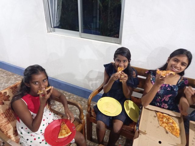Gemeinsam mit Frank haben wir einen Filmeabend für die 20 helfenden Mädchen veranstaltet. Damit wir die Gruppe etwas aufteilen, durften zuerst die „ganz großen Mädchen" kommen und nächsten Samstag dann weitere. Um 19.30 Uhr trafen wir uns alle in Franks Garten und haben zuerst Pizza bestellt. Für mich die erste Singalesische Pizza und ich muss gestehen, dass auch in einem weit entfernten Land wie Sri Lanka, die Pizza echt gut schmeckt. So bekamen alle „Chicken Pizza" und Softdrinks. Eine gelungene Abwechslung zu der täglichen Portion Reis und auch den Mädchen hat es eindeutig geschmeckt. Von den 13 bestellten Pizzen blieben keine übrig.