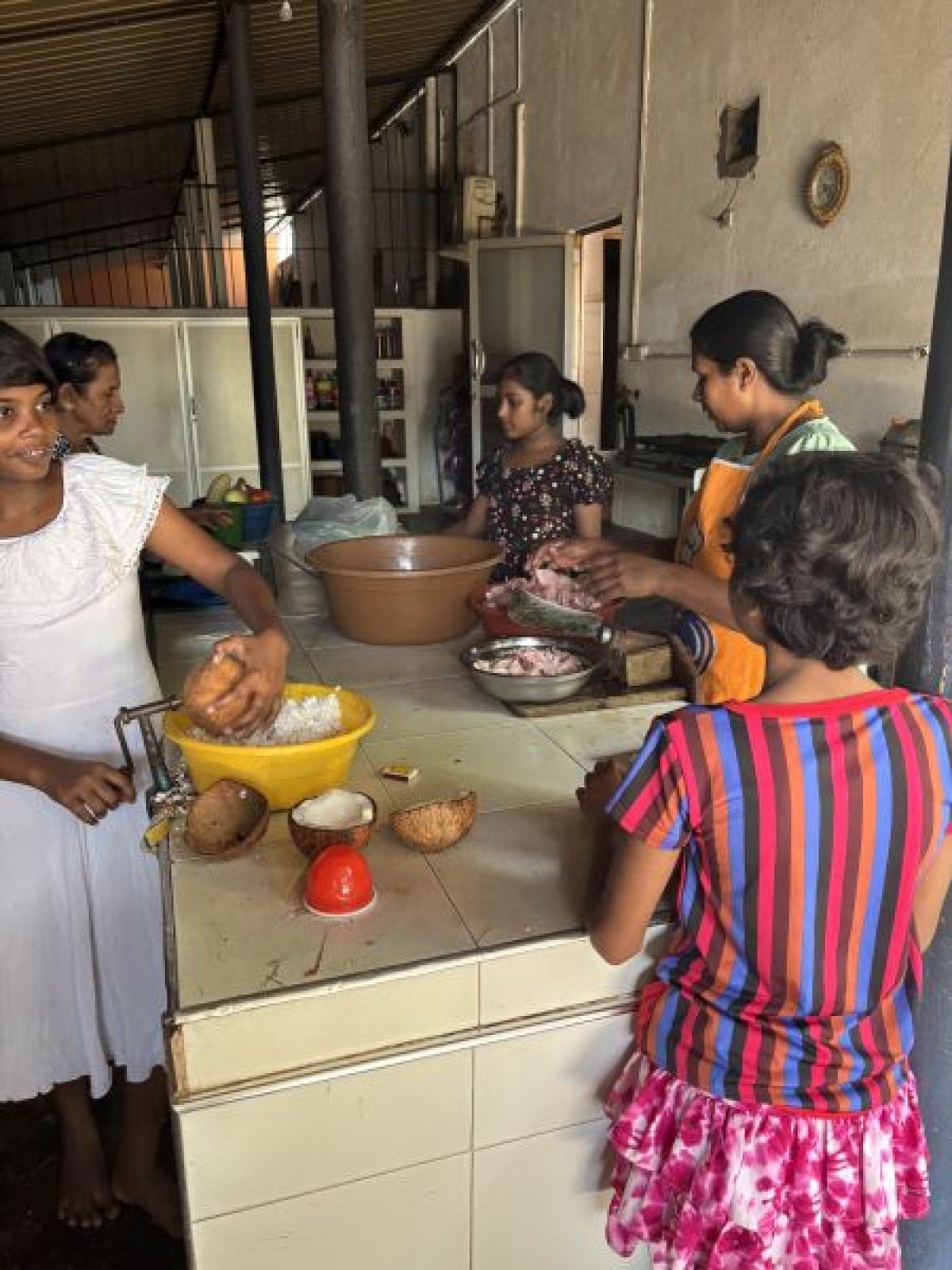 Morgens begann ich erstmals damit, das Essen für die Mädchen mit zuzubereiten. Es ist wirklich beeindruckend, wie viel Zeit unsere liebe Deepani täglich investiert, um jeden Tag ein köstliches Mahl auf den Tisch zu zaubern. Obwohl sie tatkräftig von allen Seiten unterstützt wird, beansprucht die Zubereitung dennoch mehrere Stunden. Unsere kleinen Meisterköche erklären mir im Handumdrehen, wie ich richtig zupacken muss, damit das Gericht des Tages – ‚String Hoppers' mit Gurkensalat und Curry – auch gelingt. Egal, ob es ums Knacken der Kokosnüsse, das Nudelkochen oder das Schneiden des Hähnchens geht, sie scheuen sich vor keiner Arbeit. Alles wird gemeinsam erledigt, damit sie später die wohlverdiente Auszeit genießen können.